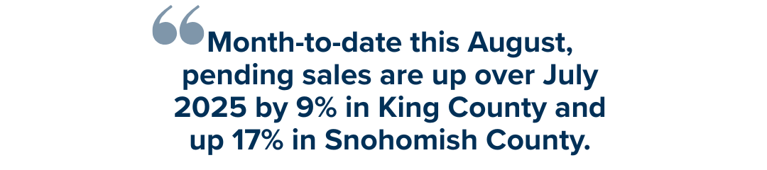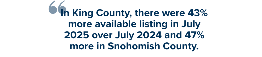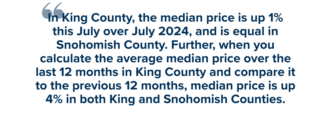This has resulted in median price growth becoming flat, but not faltering. In King County, the median price is up 1% this July over July 2024, and is equal in Snohomish County. Further, when you calculate the average median price over the last 12 months in King County and compare it to the previous 12 months, median price is up 4% in both King and Snohomish Counties. We are nowhere near a free fall in prices; what we are experiencing is a deceleration in price growth. Since this has followed the unprecedented double-digit, year-over-year price growth we saw during the pandemic, some may see this as the sky is falling, which is simply wrong. This is a good thing!