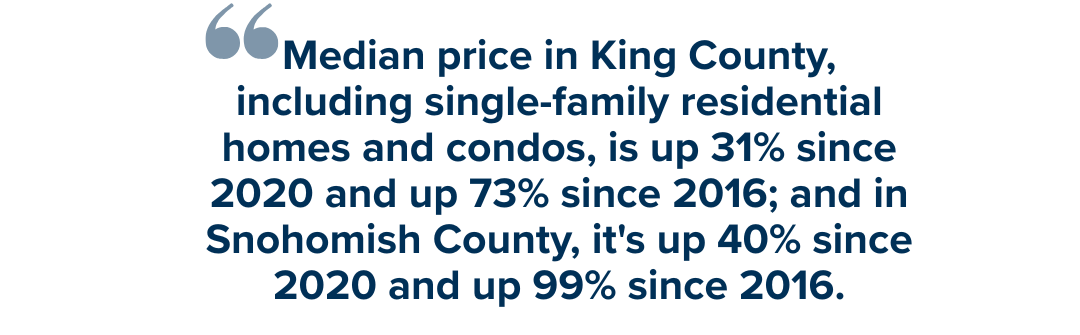 The abundance of equity that was gained over the last five years and certainly over the last decade has many sellers making great gains. Median price in King County, including single-family residential homes and condos, is up 31% since 2020 and up 73% since 2016; and in Snohomish County, it’s up 40% since 2020 and up 99% since 2016. Bear in mind, real estate is a long-term hold investment, and timing a sale after the original purchase can have an impact. We are seeing many Baby Boomer sellers start to make big moves towards retirement, enjoying their well-earned financial freedom and, in some cases, addressing health needs. The move-up buyer/seller is returning to the market as well, putting their equity to work for them to purchase a home that better fits their household size and preferred location.